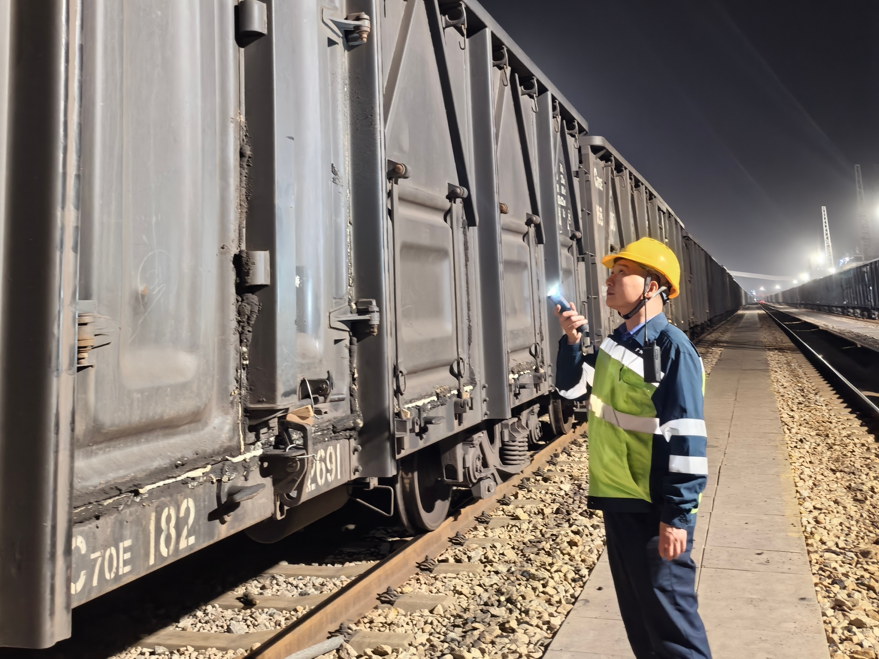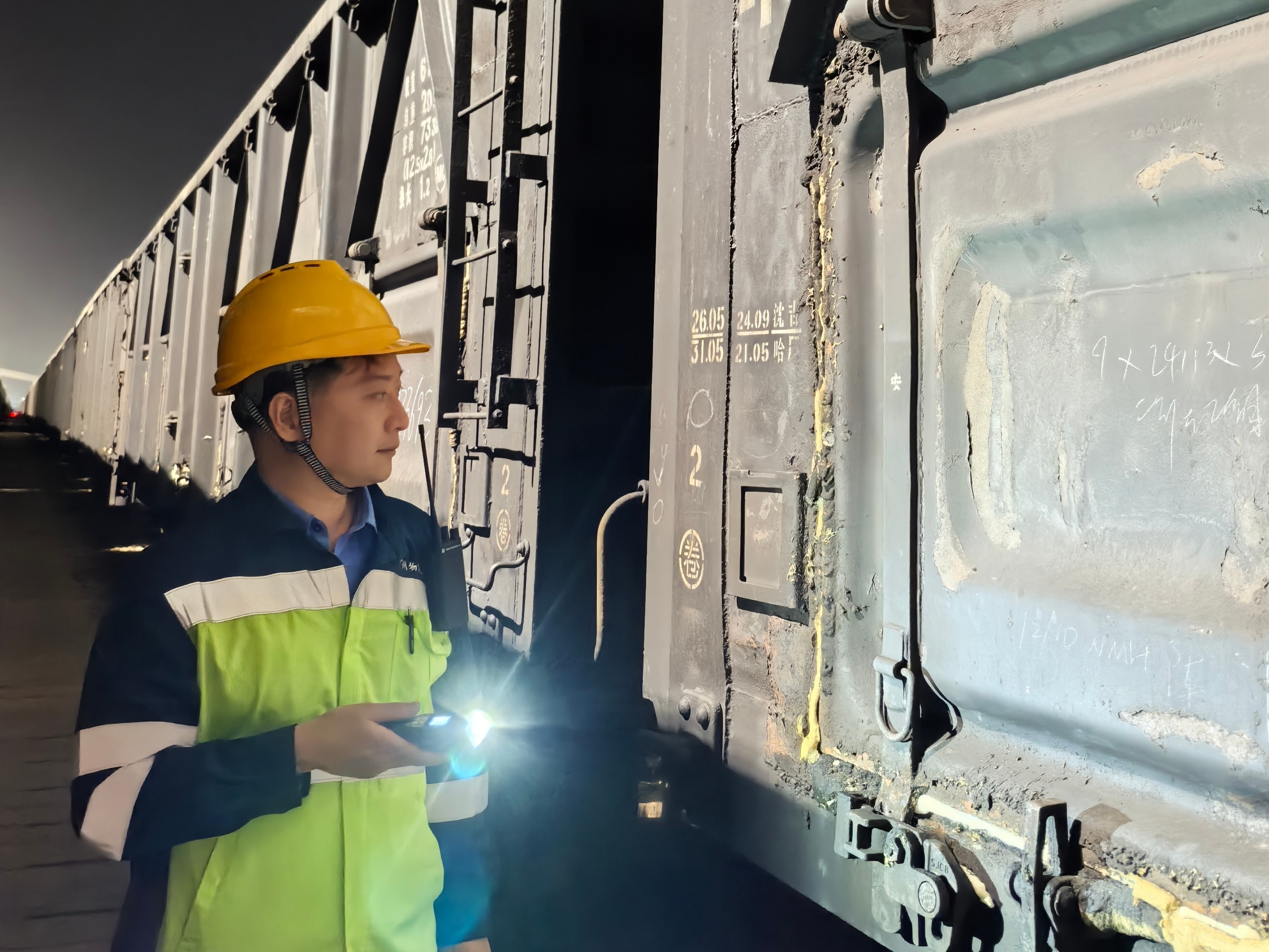 1时15分,作业现场。“看煤先看门,一缝都不能差。”这是张忠诚始终坚守的工作准则。在即将发车的电煤列车旁,他蹲下身,沿着车厢门缝仔细排查,不放过任何一处细节。发现锁扣受力不足,他立即叫来同事现场处置。